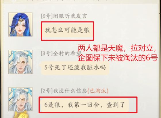 *实例:2号和6号都是天魔,已经被淘汰的2号被大多数人认定为天魔。这个时候他踩自己的队友6号是天魔,企图让好人觉得他说的是假话,从而保下6号。