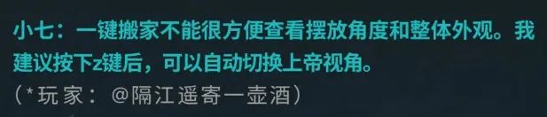 除了家具获取,开发组还参考了建造大佬们针对视角提出的反馈,为建造模式添加了全新的飞行建造视角,这下就不用为了修一个位置而拆掉全屋了,360度全景无死角机位可以帮大家提前看清并规划好整个建造场地!