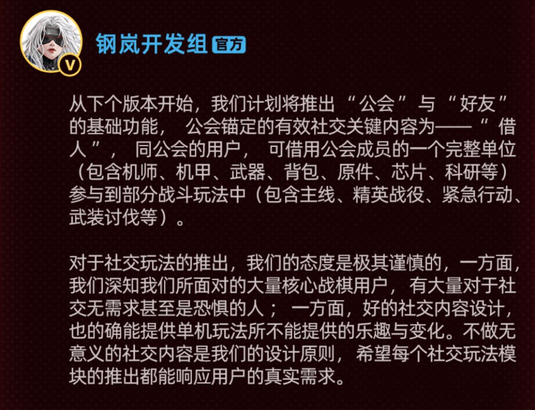第四点则是社交方面的反馈,钢岚这款游戏从最初设计开始是没有加入几乎任何的社交系统的,除了一个已经能自动完成的“标靶”玩法之外,你说钢岚是个单机游戏我都信,而例如天地劫这些游戏则是开服后便具有公会、世界频道等交互功能的,所以维一预估钢岚的制作班子其实本来并没有想做这方面的功能,他们想做的是一个更加纯粹的机甲战棋游戏,但奈何胳膊拧不过大腿,所以这次的反馈就跟上次的机身全身立绘有点类似了,不得不为之,为了大部分玩家们的反馈而做。