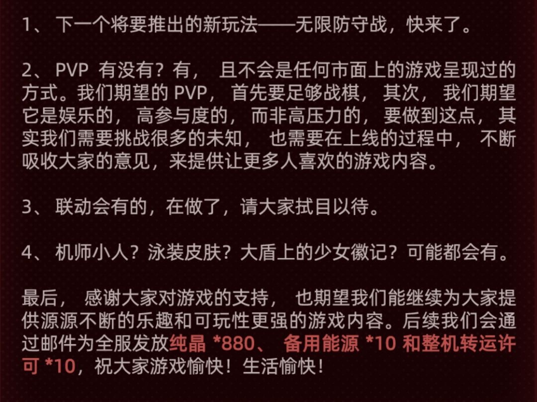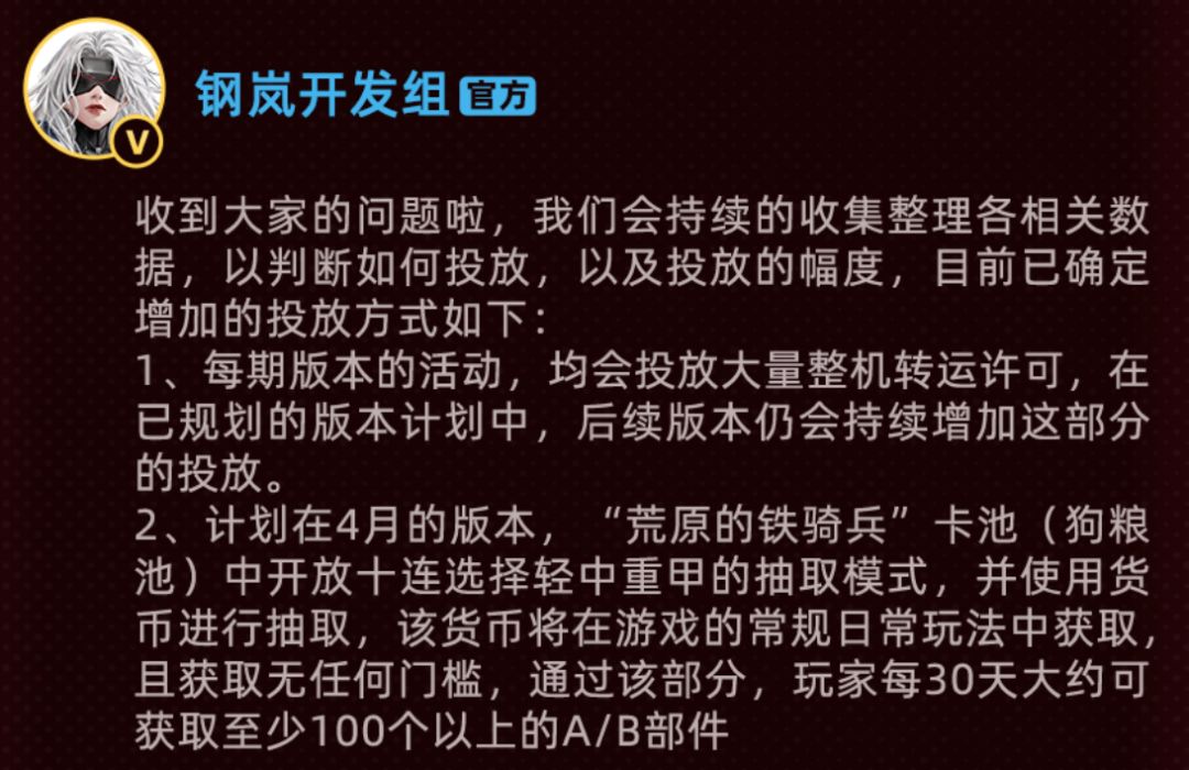第二个反馈则是对于狗粮数量严重不足的反馈,在官方此次的回答中除了给到了明确的增量投放计划外(这个投放量可以实装的话应该会是一个不错的优化),还有一个重要的信息便是4月版本的主题为“荒原的铁骑兵”,当然这两天测试服也快开了,不少朋友也在期待是不是这次的测试服便可以体验到1.4版本的内容呢?对此维一只能说大家想多了,这次测试服主要是为了体验神级罗娜和1.3版本下半部分的那个军校限定副本而开的,而针对1.4版本的信息目前还较少,但“游骑兵”这个新机兵是不是能借机上线呢?