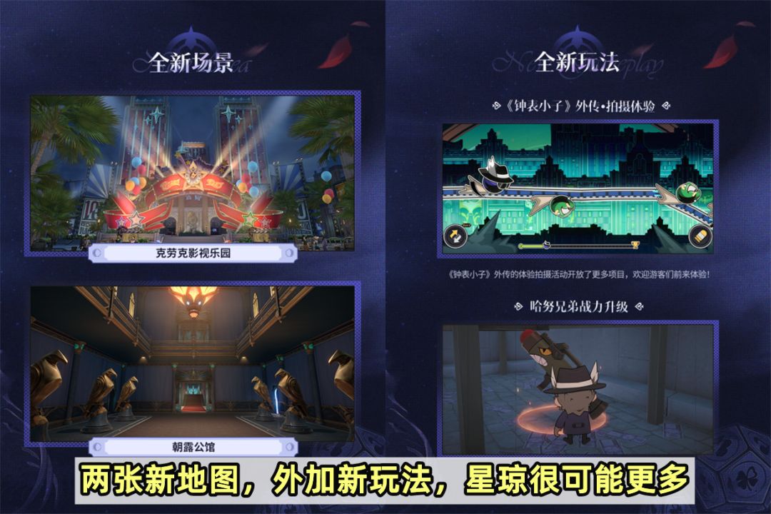 然后是新地图,2.1将新增朝露公馆和克劳克影视乐园两张新地图。探索过2.0版本新地图的小伙伴应该都知道,匹诺康尼地图的内容量之大。不仅宝箱多,而且还有诸如折纸小鸟、修复钟表、收集贴纸等均能获得星琼的玩法。到了2.1版本的新地图,这些玩法估计都会继承下来;而且前瞻还说了会新增《钟表小子》外传·拍摄体验,和哈努兄弟战力升级两种新玩法,所以很可能会有更多星琼。
