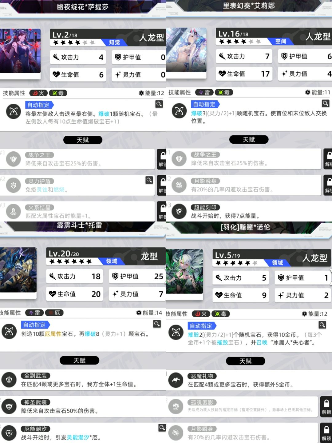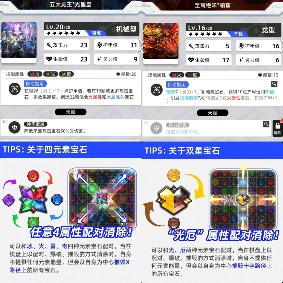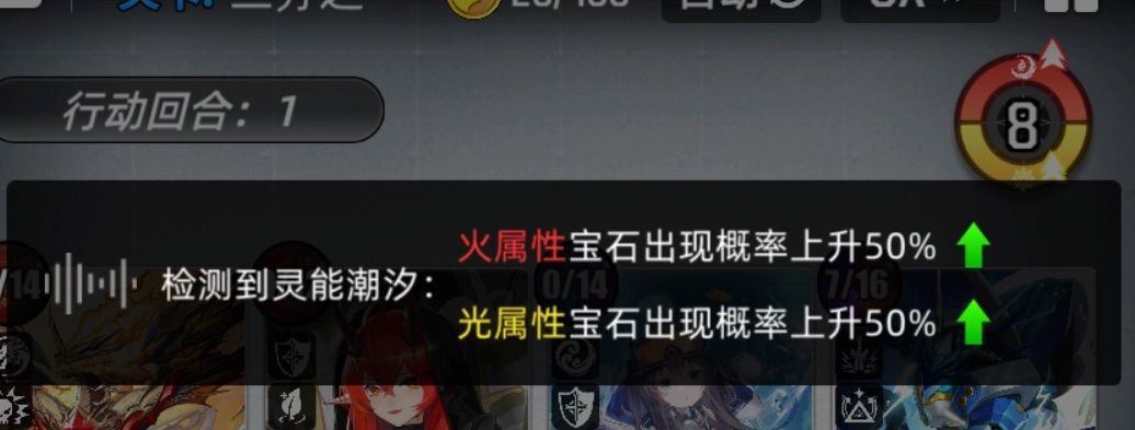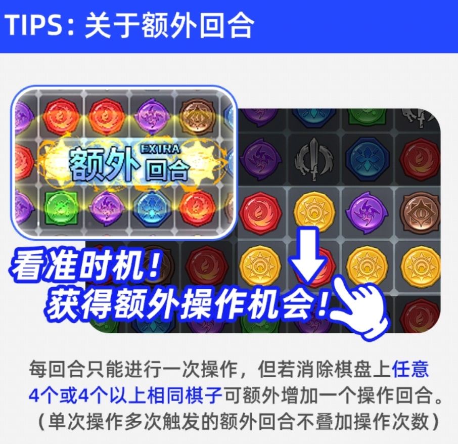 *某些角色在同条件时获得额外回合的几率上是可以等价的:摧毁5×5与爆破3×3;爆破数量相同的里表幻奏、幽夜绽放和托雷;爆破数量55与摧毁数量64;无潮汐时创造12单属性宝石的纯白蕾娅和微睡和约顿;无潮汐或对应属性潮汐的游戏小神和超频千竹;无潮汐时爆破所有单色宝石的金运和贴身