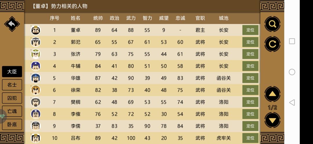 隐藏攻略:长安有贾诩,让阳仪去招募,每年招募,洛阳有陈宫,让卢植去招募,每年都招募。贾诩和陈宫都可以去大城当太守。吕布和华雄是战力当担,有钱先装备这两个人。汝南必拿,襄阳不打,难打。