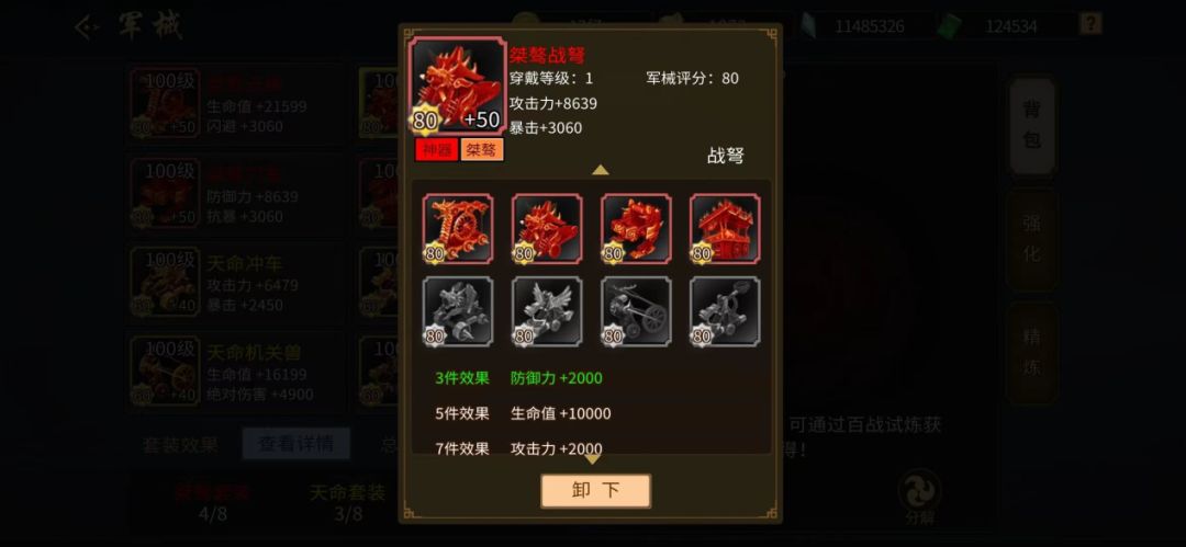 红色桀骜军械对比金色军械,其中强化的基础属性提升了1/3,精炼基础属性提升25%,精炼过程中激活的精炼条属性也提升了两成有余!由于神器桀骜军械的优异内在,培养难度自然也要高于金色品质军械。百战试炼25层以上产出的战利品宝箱,有概率掉落金色百战军械部件碎片;30层以上的战利品宝箱才有概率产出天命部件碎片;而红色桀骜军械套装碎片需要百战试炼50层后的战利品宝箱才能开出。由此可见,越是优质的高级装备就越稀有也越值得拥有,但获取难度也是最大的!可一旦拥有且培养到位,带来的属性和战力提升是巨大的。