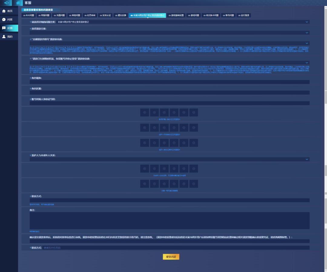 2. 退款表单填写:点击【客服中心】-【反馈】-问题分类选择【未满16周岁用户停止登录退款登记】填写退款表单信息,包括未满16周岁用户账号信息、未满16周岁未成年人身份验证信息、其监护人身份验证信息及充值订单情况,选择退款方式及签订退款协议等并确认提交退款申请。