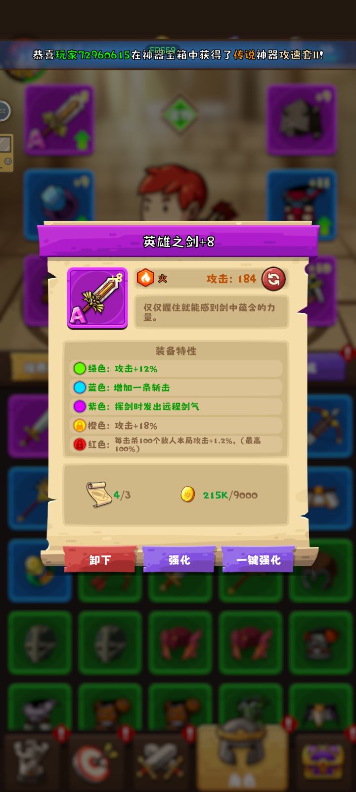作为一个刚刚入坑1天的新人小白,整个游戏还都是在探索之中。试完了几关都在割草和肉鸽的快感中很快就结束了,但随着还卡难度的提升,伤害也是少的可怜。无意之间在装备栏看到了一个按钮,就是装备强化,材料就是装备书跟金币,相对于升级龙和科技的材料来比,性价比还是很高的。