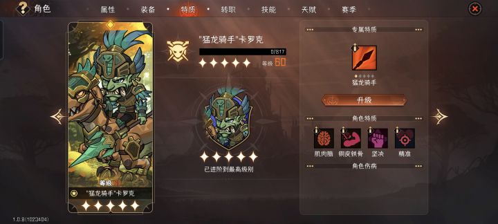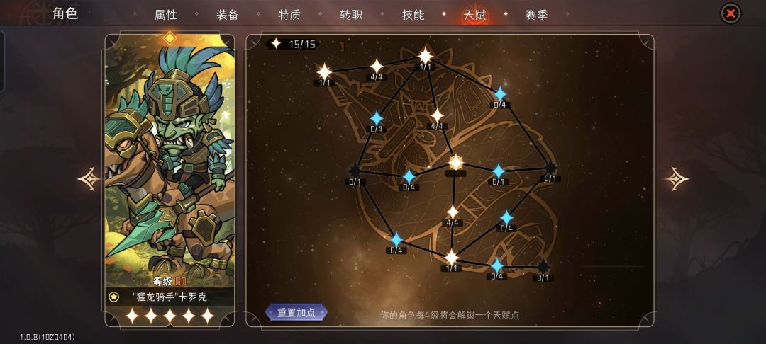 4.技能搭配:上挑斩+冲锋+枪阵,核心词条上挑斩穿透概率+80%。冲锋是为了打出一回合推2次的效果,战吼剑圣带即可。枪阵这个技能很变态,他和技能范围无关,只和攻击距离相关(需要点出按最大攻击距离触发的金词条),开荒120用的上,平时刷材料带长枪突刺即可。