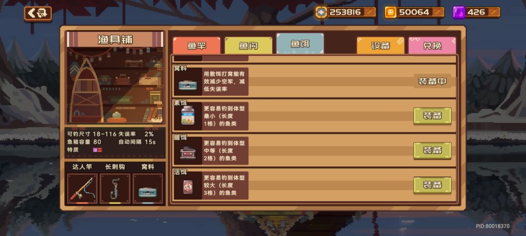 鱼饵的作用和鱼钩类似,只不过是专精体型特质,比如素饵(专钓1格鱼),腥饵(专钓2格鱼),活饵(专钓3格鱼),除开窝料(降低3%失误率)。附鱼饵: