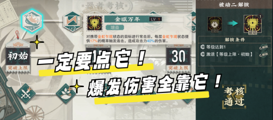 金瓯永固杯的被动技能“屠苏迎岁”可以让她在攻击敌人时,为敌人添加金虹乍现状态。此状态可以让敌方在受到由自身造成的伤害后,额外触发一次伤害,而且该状态层数可以叠加。金瓯永固杯剩下的两个被动“金瓯万年”、“三象分足”则可以增加她攻击带有金虹乍现状态的敌人时的伤害,并有几率触发连击,进一步加快了她的战斗节奏。