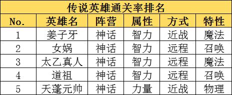 传说英雄登场通关率排行前五的英雄分别为: