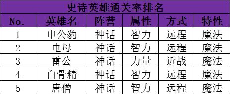 史诗英雄登场通关率排行