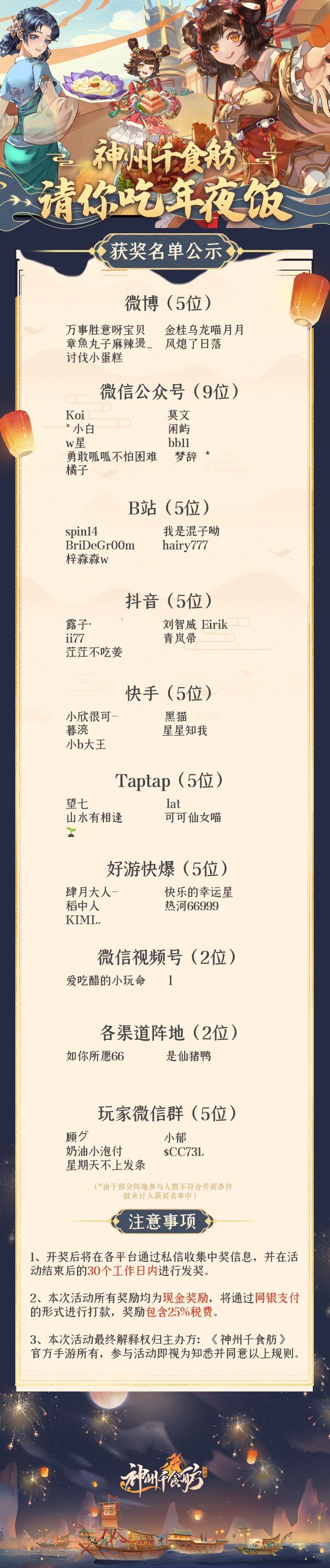 舫主们还记得咱们约好的年夜饭嘛?没错!又到了粥粥最喜欢的开奖环节!让我们恭喜以下幸运舫主获得【300元年夜饭基金】!天呐粥粥都不敢想要是能获得这个奖粥粥会是一个多么活泼开朗的小女孩!舫主快快认领自己吧~