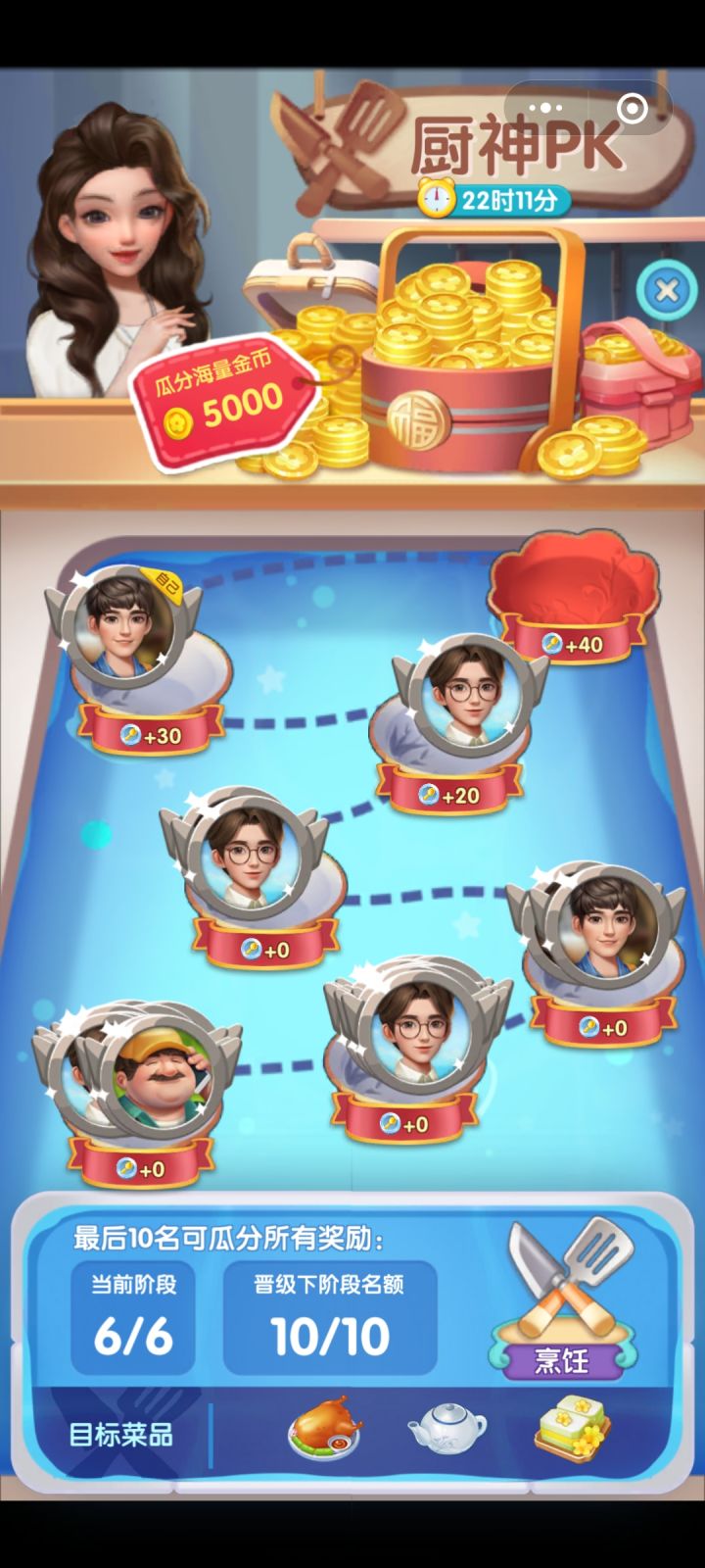 率先完成六个订单的10人能够瓜分5000金币,每个人500金币,或者到了晚上12点只有你完成一个人拿完
