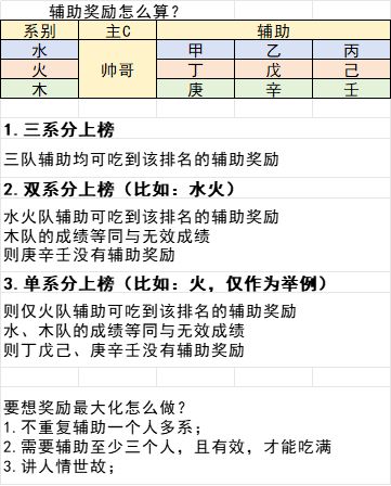 由于规则没有对辅助奖励一块说得很清楚,这里是询问策划后,得到的答案: