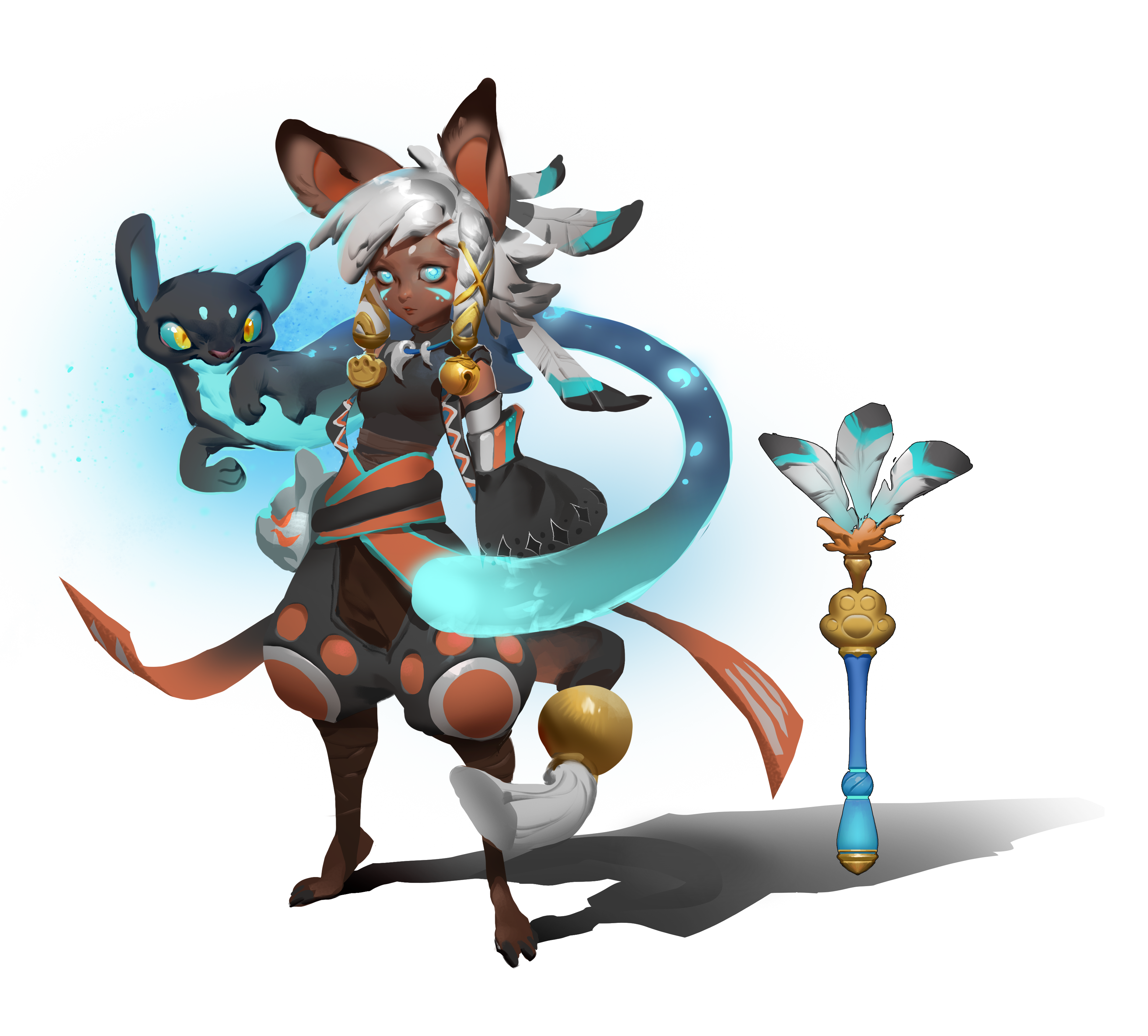 乌雅的整体设计围绕着猫与魔法,灵猫克鲁是乌雅最爱的伙伴,乌雅的武器既是魔法棒也是逗猫棒。在战场上,克鲁寸步不离地跟随乌雅,陪伴,是她们对彼此的约定。