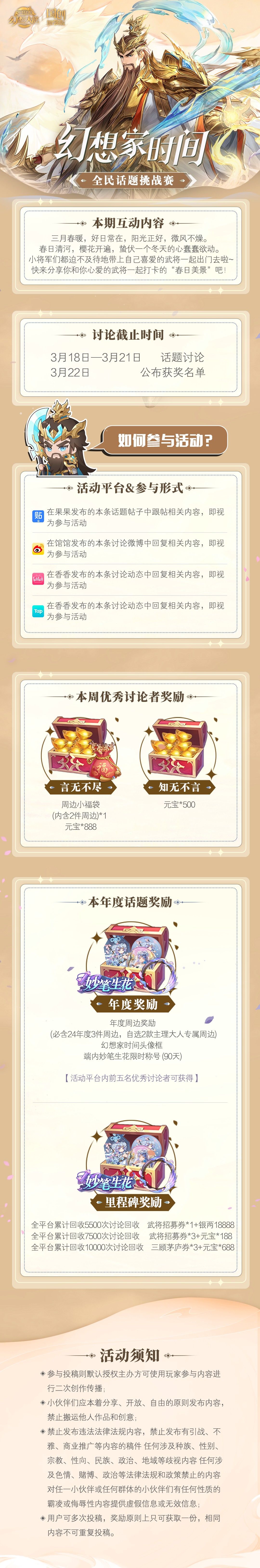 三月春暖,好日常在,阳光正好,微风不燥。 春日清河,樱花开遍,蛰伏一个冬天的心蠢蠢欲动。 小将军们都迫不及待地带上自己喜爱的武将一起出门去啦~ 快来分享你和你心爱的武将一起打卡的“春日美景”吧!