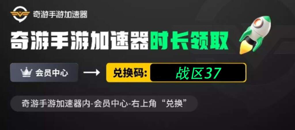 3、游戏安装好后记得使用奇游加速游戏噢~有效避免无法登录及游戏网络延迟的问题!小伙伴们可以前往会员中心输入兑换码:战区37 即可领取会员时长(其他游戏也可以用噢)