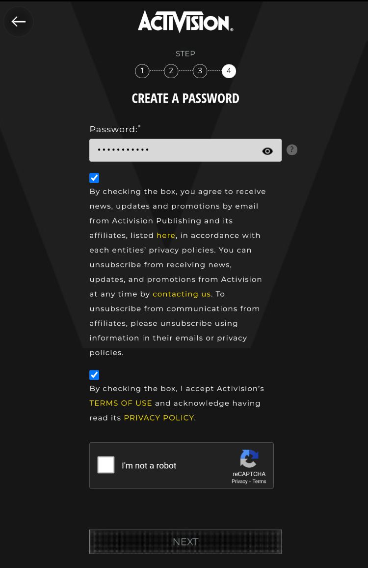 6、根据提示设置你的动视账号密码,并进行非人机验证噢