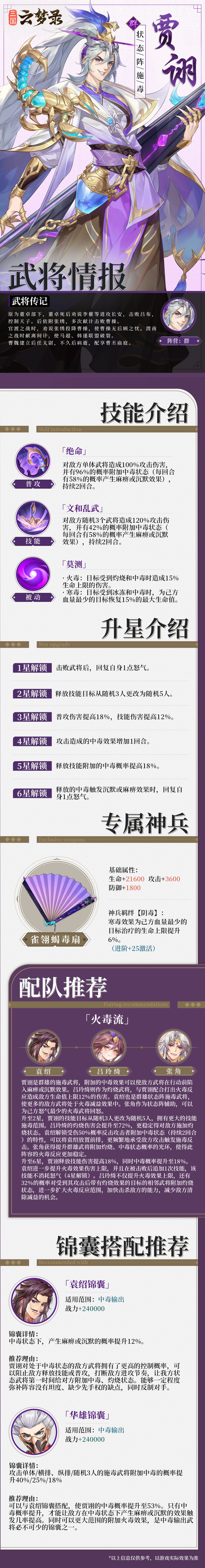 与其他谋士不同,贾诩一生奇谋无数,故有毒士之称。在《三国云梦录》中,毒士贾诩也有云梦大陆中独特的毒招,攻击不仅有中毒效果,还能使敌将受到相当