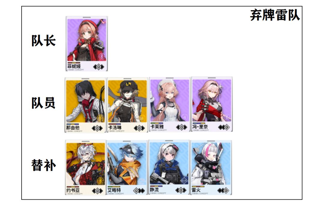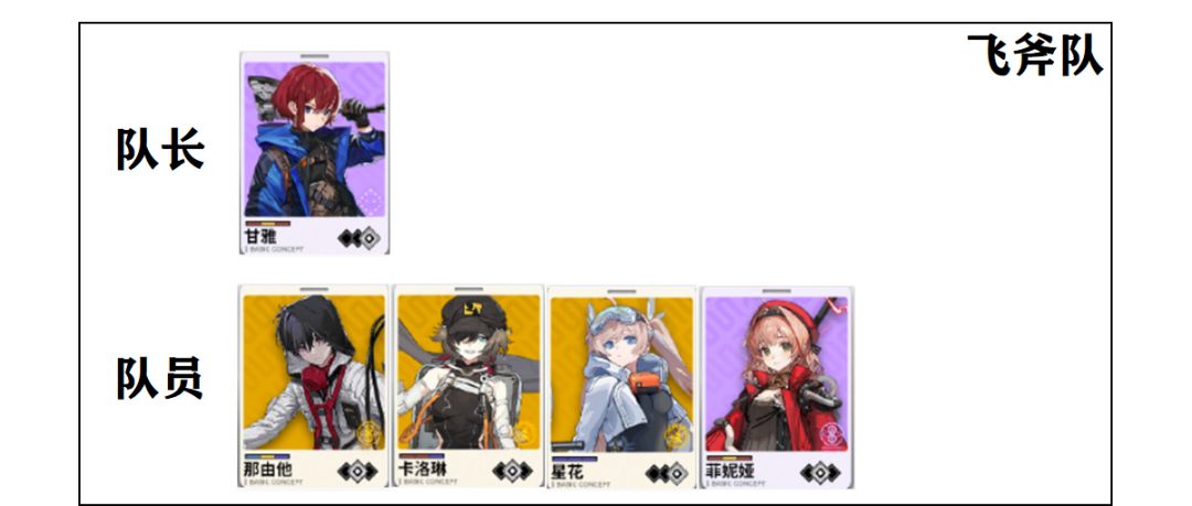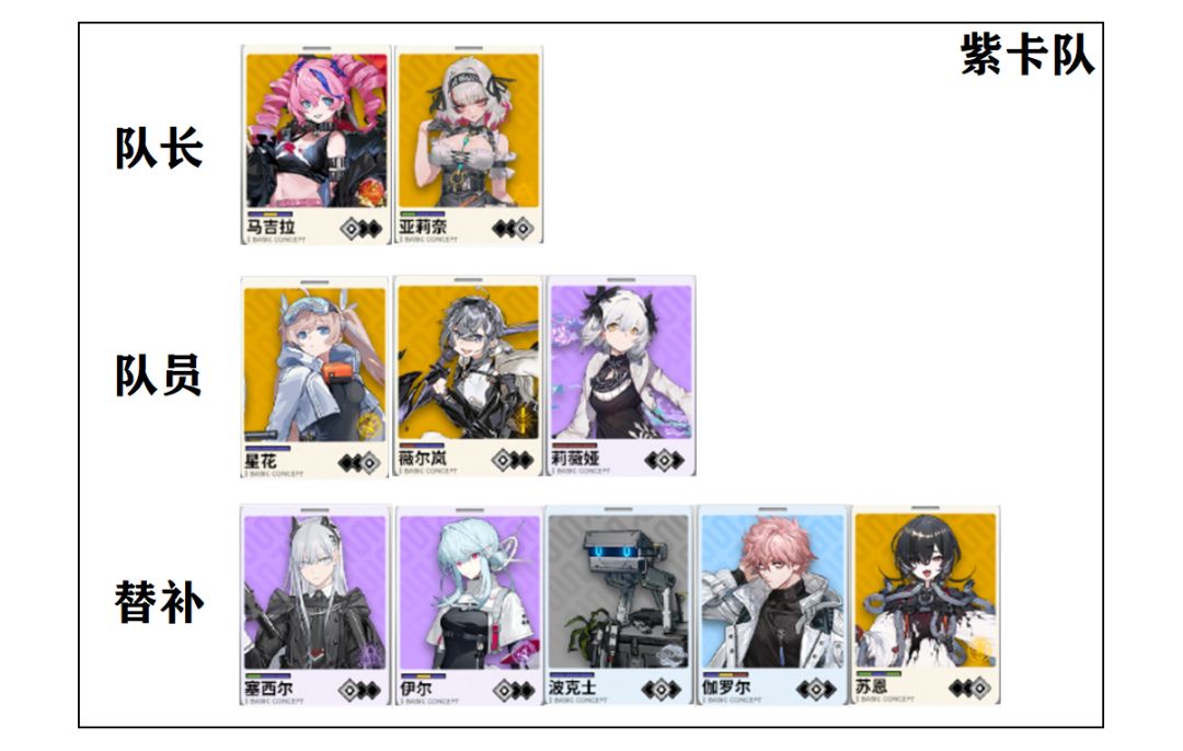 思路:围绕紫卡(也就是紫色特殊类型的卡)的高质量队员和高质量队长的组合,队长可以由亚莉奈(单体/高压环境)或者马吉拉(群体环境)担任。