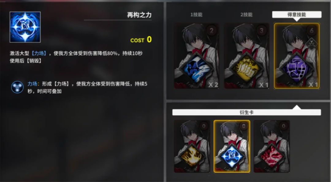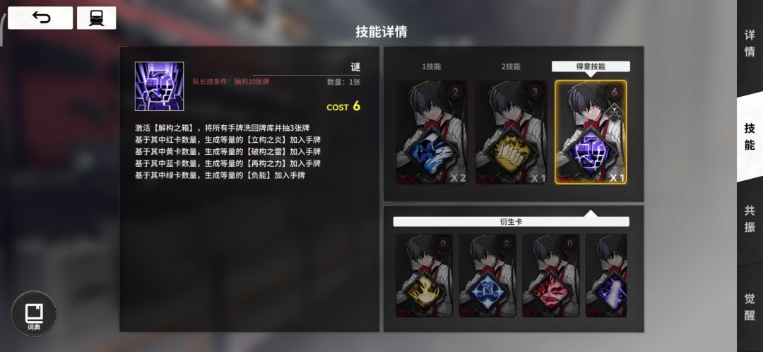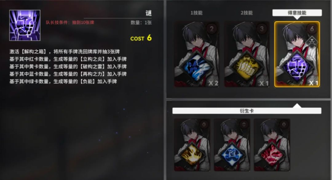 思路:以那由他+苍叶为核心,那由他的队长得意技【谜】能将所有手牌洗回牌库,再抽3张牌,并根据洗回的卡牌颜色生成对应颜色衍生牌,在实战中效果是(从右往左依次)将所有手牌洗回牌库,再(依次)抽3张牌。而在衍生牌中,蓝色【再构之力】能够提供80%的10秒减伤,是我们生存的核心。同时,那由他的黄卡【洗牌】效果为被其他卡丢弃时抽3张卡,苍叶的【捭阖】在一觉后可以获得被丢弃时,获得5点费用,这两张卡是无限循环【谜】获得【再构之力】的保障。