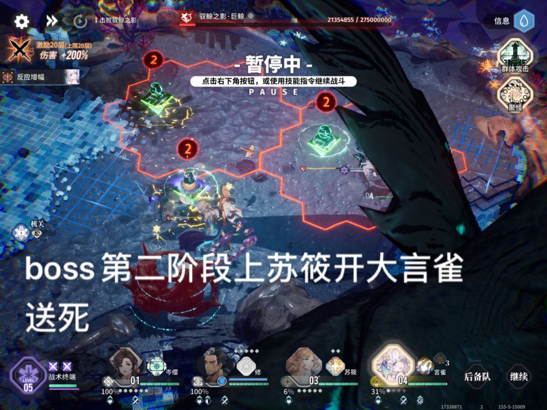 注意⚠️因为言雀在这个阶段拉完炸弹技能次数已经不多了,这时候换上苏筱,开大让言雀送死,给言雀回技能+全队变肉。