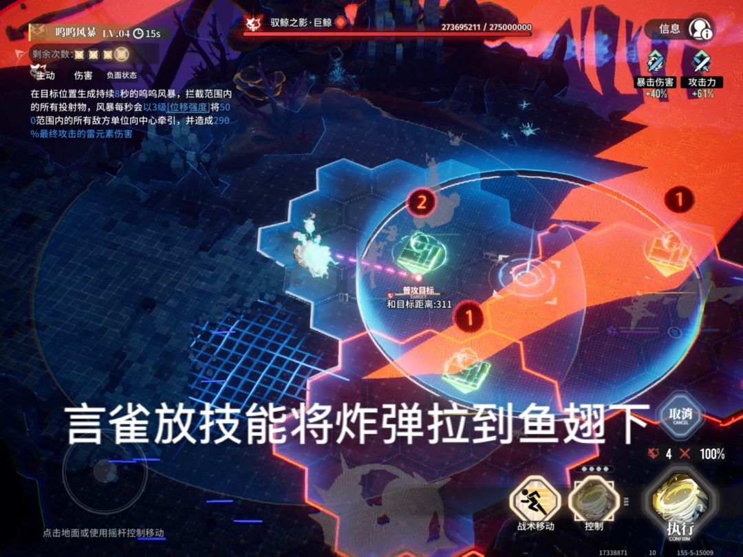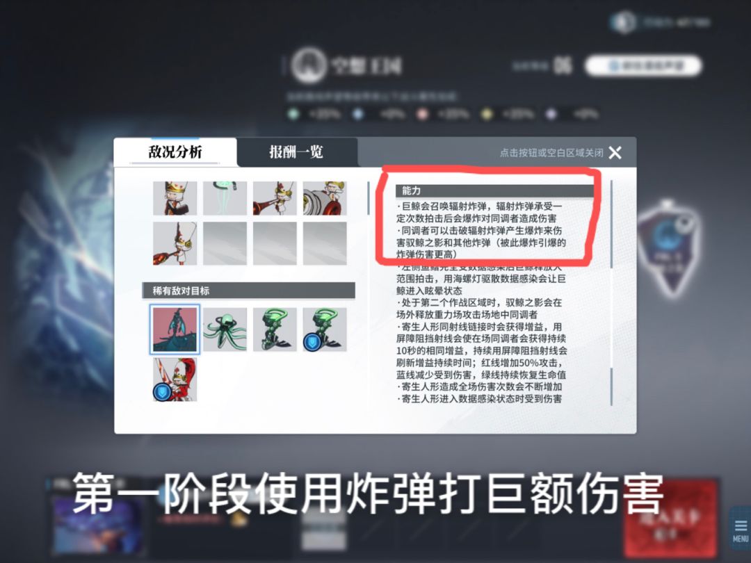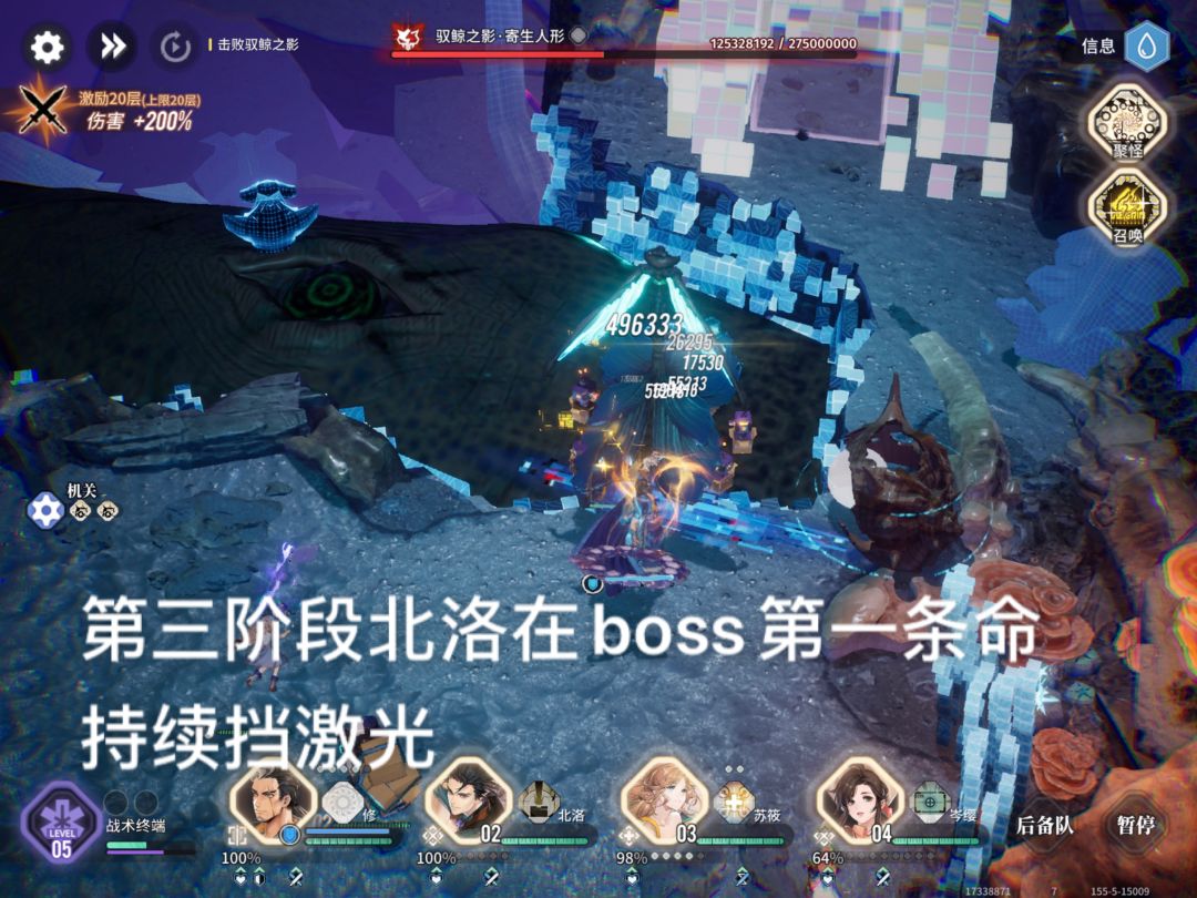 关于第一个boss大鲸鱼,可以把T放在终端旁边,替终端分担伤害。主要讲一下图4我画红圈的部分,困难的鲸鱼还没有这么肉,直接打还是比较好打的,这个图里最好是利用下面的三个炸弹去打这个鲸鱼,具体打法见图5,当鱼翅拍下来时立刻用言雀的技能将三个炸弹拉到鱼翅下面,可以直接造成大量伤害。正常打躲伤害打输出即可。转场后第二条命依旧是言雀拉炸弹,注意用海螺灯照亮,伤害更高。