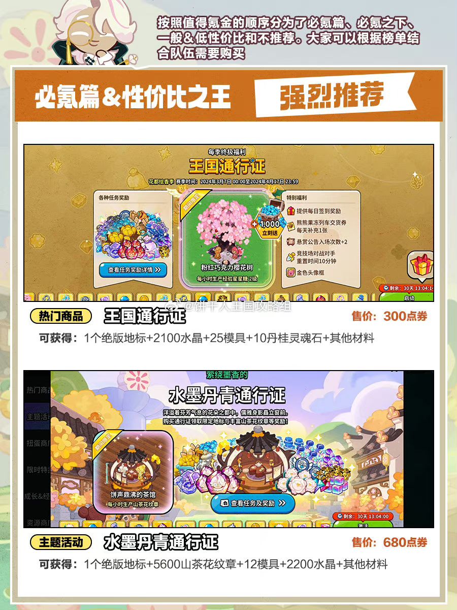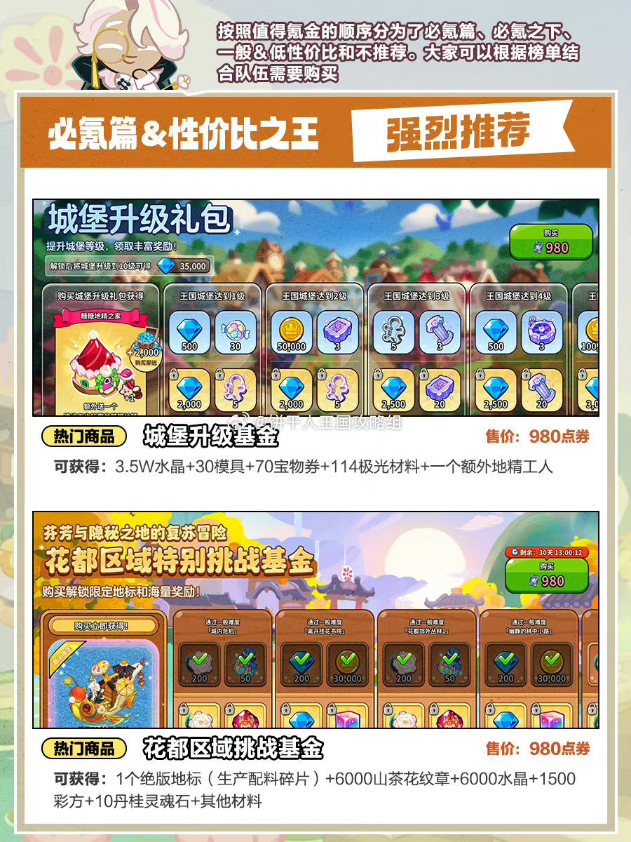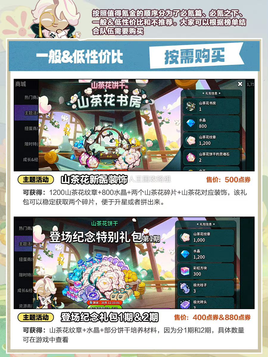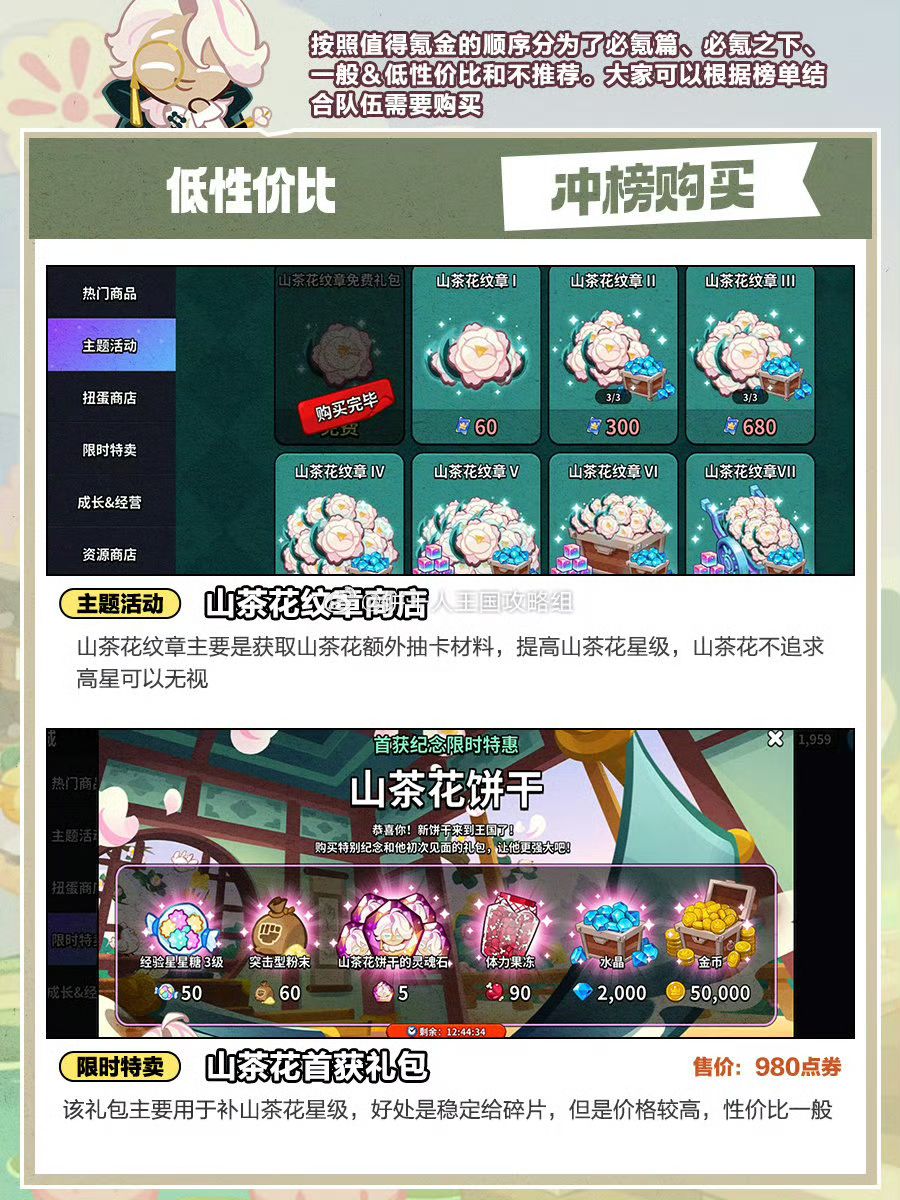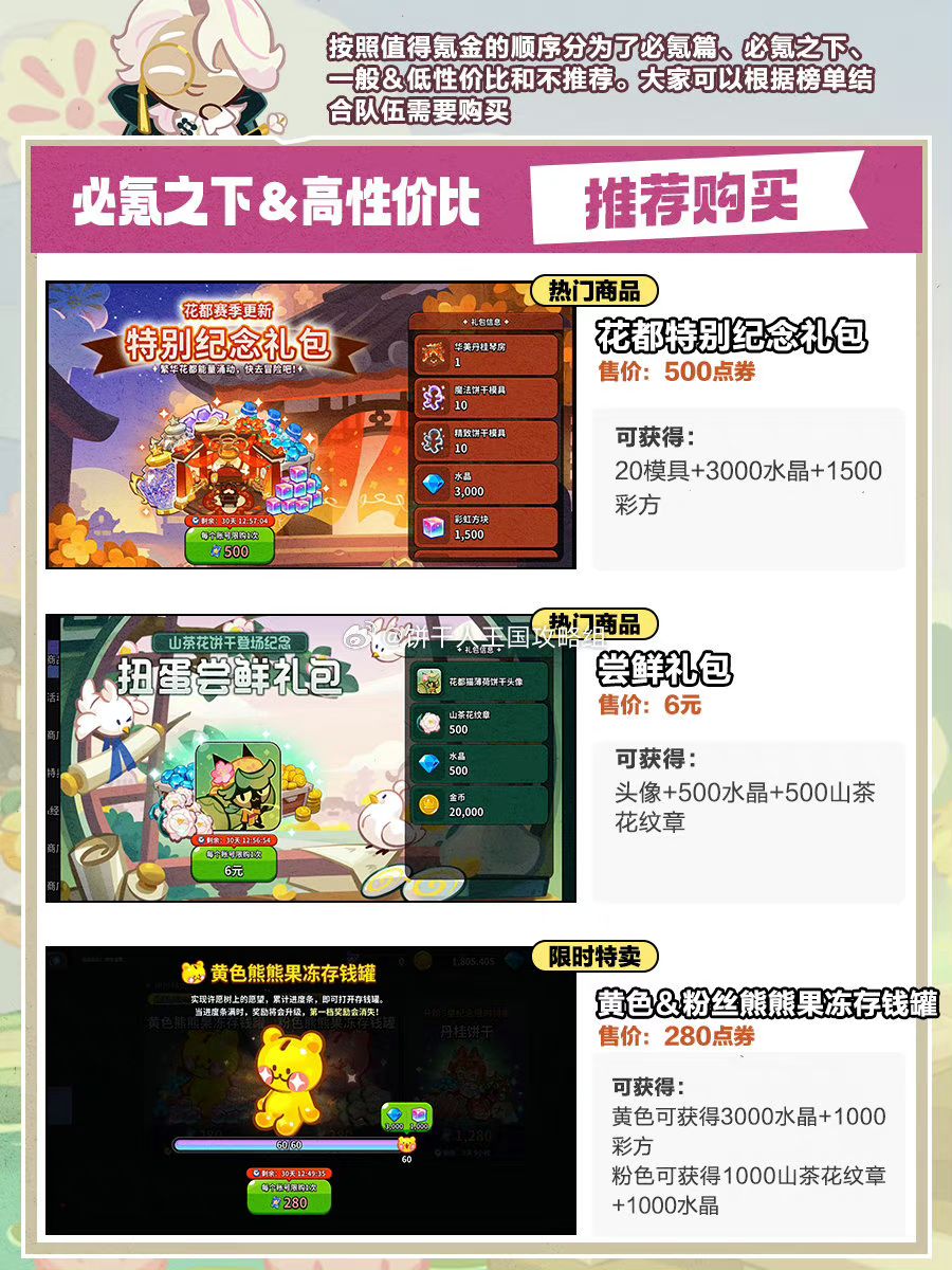花都版本礼包推荐,如果你的号上没找到对应礼包,可能是还没达到触发条件,比如山茶花首获礼包等。
