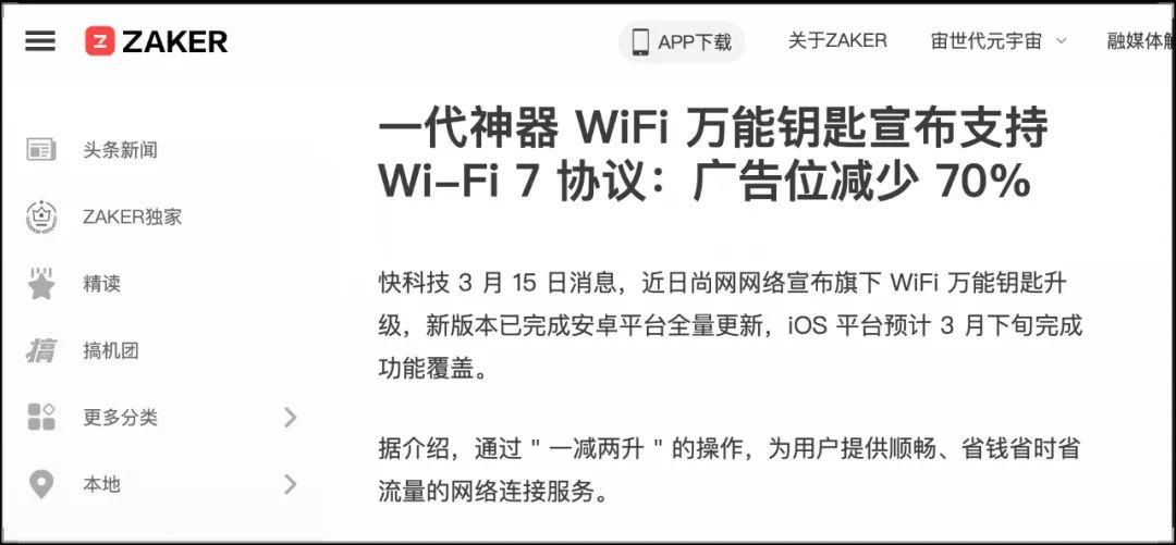 大意说是,WiFi万能钥匙新版本减少了70%的广告位,并且支持今年初进行实验的WiFi7。