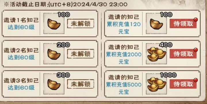 另外游戏右上角活动 寻觅知己 点我是小虾米 输入我的邀请码AAH5GP,即可 最多可获得:400元宝+马车票+8万阅历+120体力+100洗髓丹+20顺脉丹!