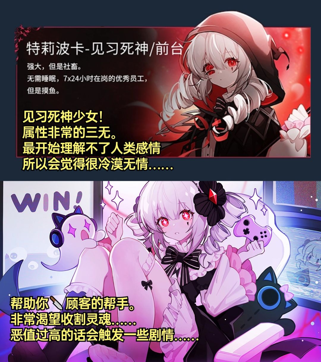 酷似蕾姆的人造人少女小叶子,傲娇红龙御姐耶芙娜,具有斩灵师身份少女夏露零(还是广东人),三只眼睛的见习死神萝莉特莉波卡,四个可攻略”员工“的人设与故事,都非常令人讨喜。虽然有一些套路让人觉得”老二次元“了。随着主线剧情推进与好感度支线故事的推进,你也会发现这四个人物背后隐藏的身世和背景,而你的一些数值也会影响结局,每一张CG都是可以截屏当桌面的质量,叫人很难不全收集啊!