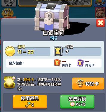 每日宝箱开启只有两个选择,用钥匙开启和花费时间开启,消耗的钥匙数量是和需要花费的时间成正比,在没有任何加成下白银宝箱需要2枚钥匙或2小时,黄金需要10枚钥匙或8小时,越往上需要花费的越大。用时间解锁宝箱一次只能解锁一个,当然也可购买特权卡进行排队解锁开启。