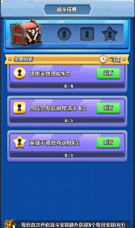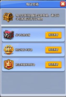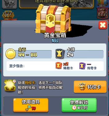 这个宝箱很特殊,它需要完成任务界面中的3个战斗任务才能解锁打开,战斗中的任务可进行刷新,降低完成任务的难度。战斗宝箱同样也会随着段位的提升而提升,它的奖励包括金币,普通卡,宝石,另外还有至少包含稀有卡数量。打开该宝箱获得的奖励有概率会获得比标注的稀有卡数量要大,甚至会获得传奇卡。