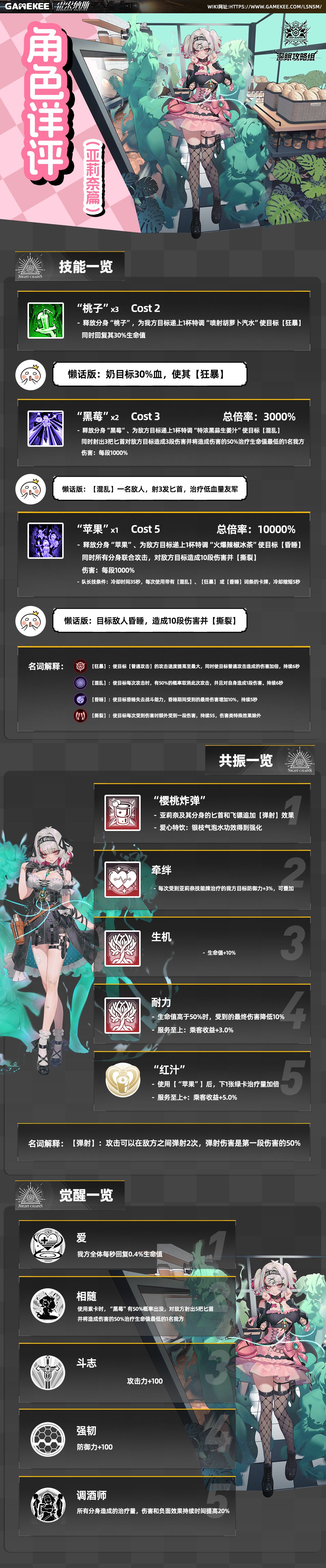 各位列车长久等了,伴随着红茶战争活动的预告发布,深眠攻略组也为大家带来了人见人爱的美丽酒保小姐亚莉奈的角色详评,请各位列车长过目