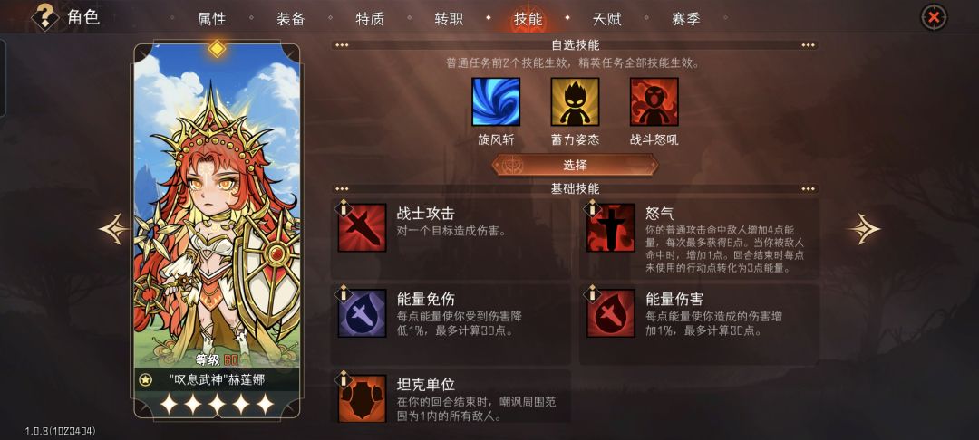4.技能搭配:旋风斩+蓄力姿态+战斗怒吼,旋风斩所有颜色词条优先点,蓄力姿态3命持续回合+1,战士系蓝蛇头持续回合+1,等于全程常驻姿态buff。