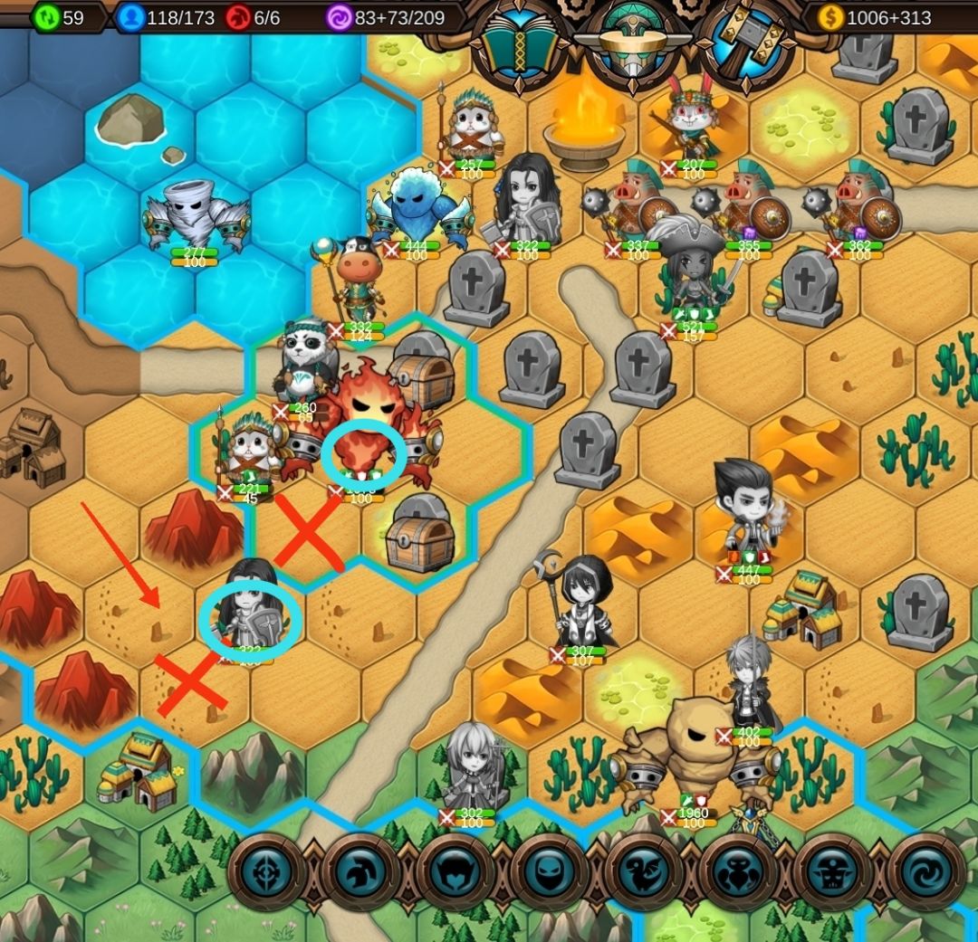 2.守城圣骑士和巨型火元素卡敌人位置,敌人只有小股敌人可以打到我的后排,我的老迈法师被减速动不了,敌人过来的话,下回合老迈法师就可以打到周围的敌人了