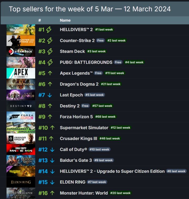 Steam上周销量榜单!榜首绝地潜兵 2