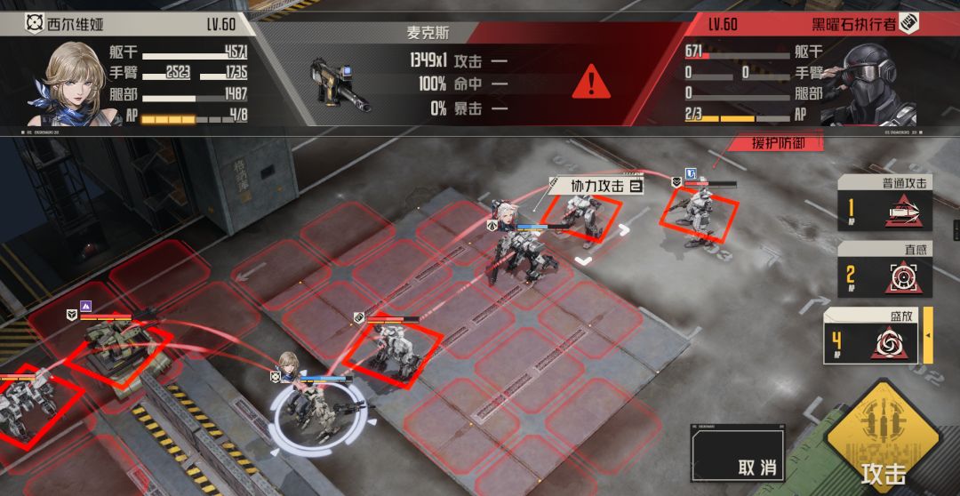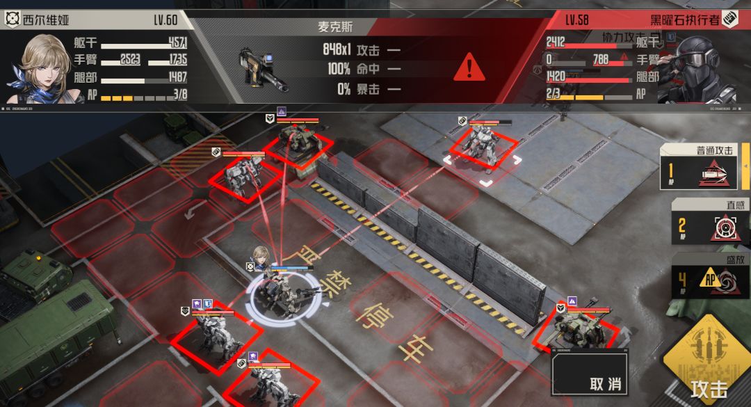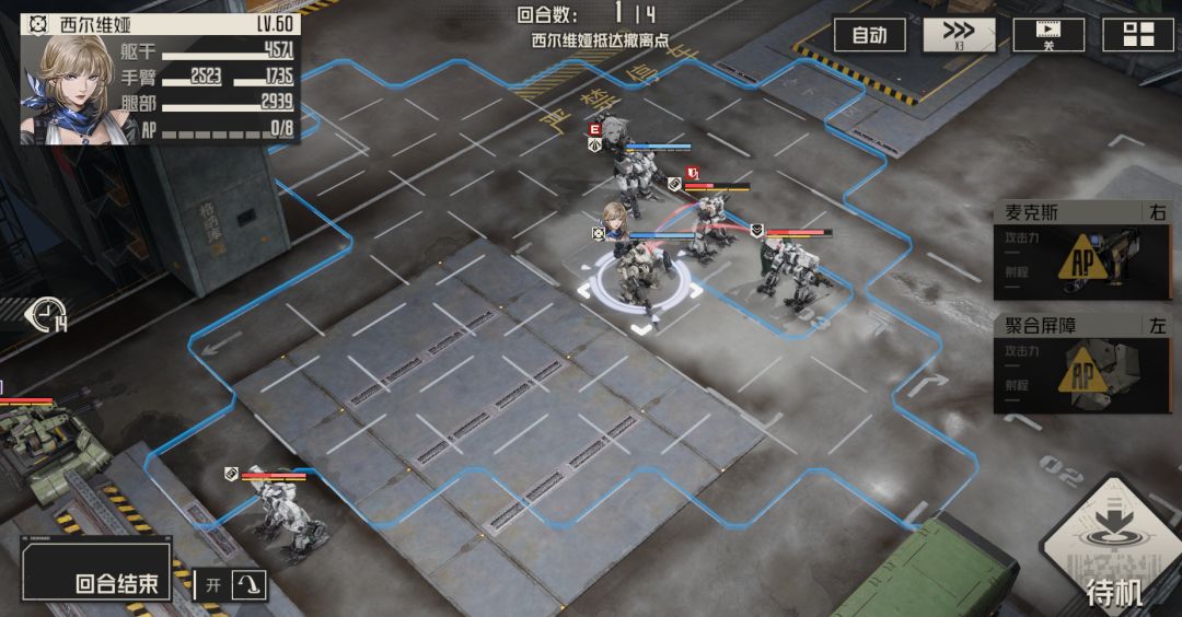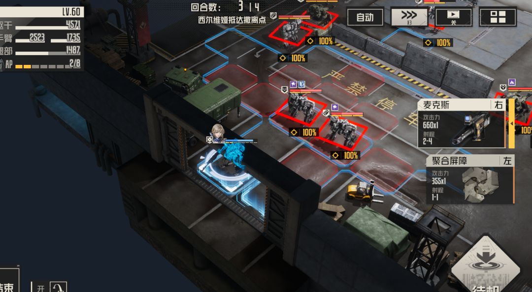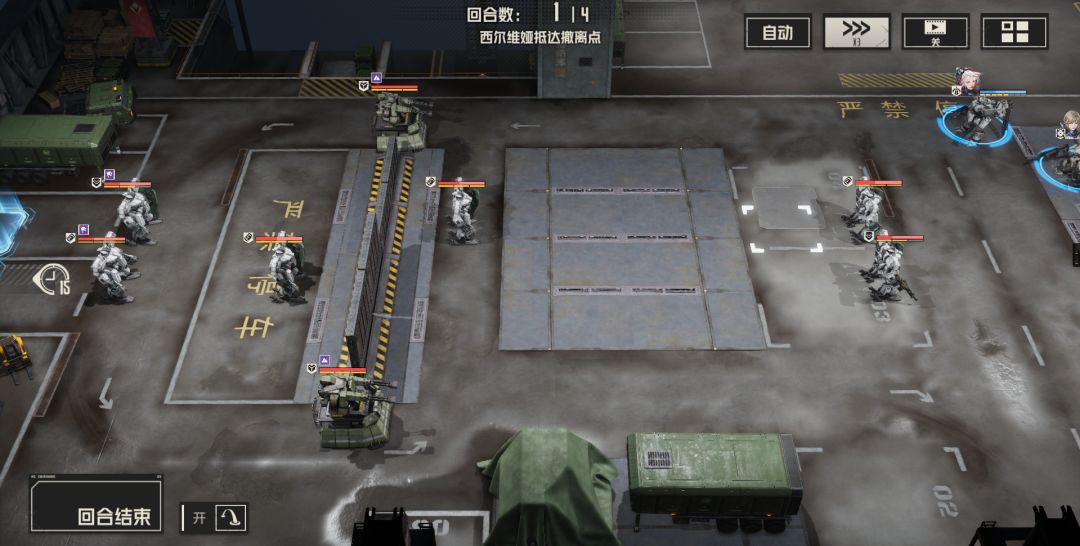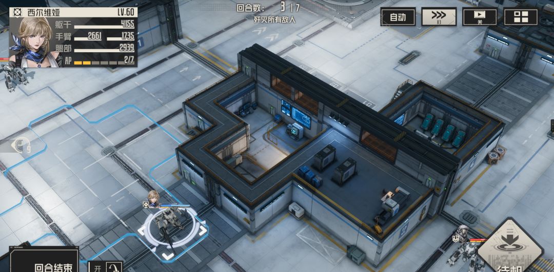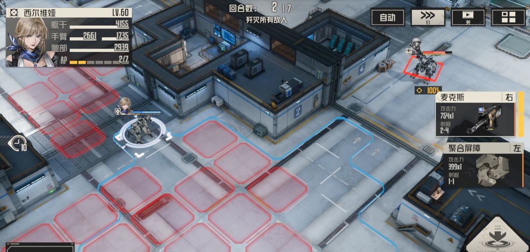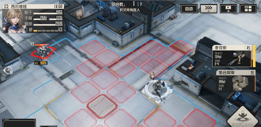 本关任务是消灭所有敌人,想要完美通关需要在5回合内通关,让西尔维亚一回合消灭两个战术兵,同时不能受到伤害。思路是利用西尔维亚天赋效果放风筝,具体如下: