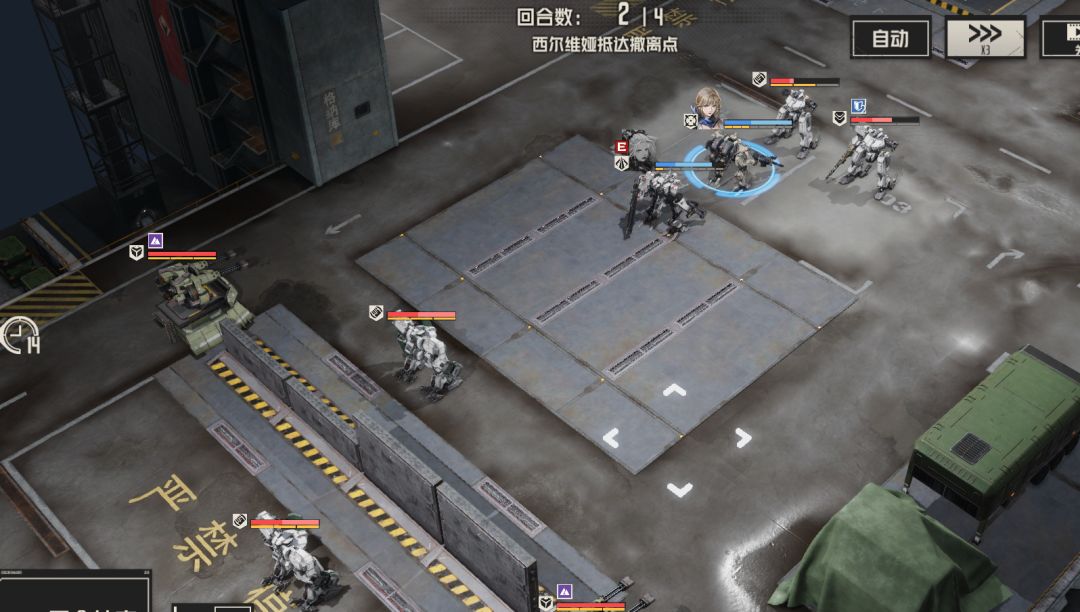本关任务是让西尔维亚到达撤离点,回合较少,只有4回合。完美通关需要在3回合内达成,确保洛莎存活及西尔维亚未受减速和禁足效果。采用的思路是多利用西尔维亚的天赋效果,避开敌人封锁,快速到达撤离点。具体如下: