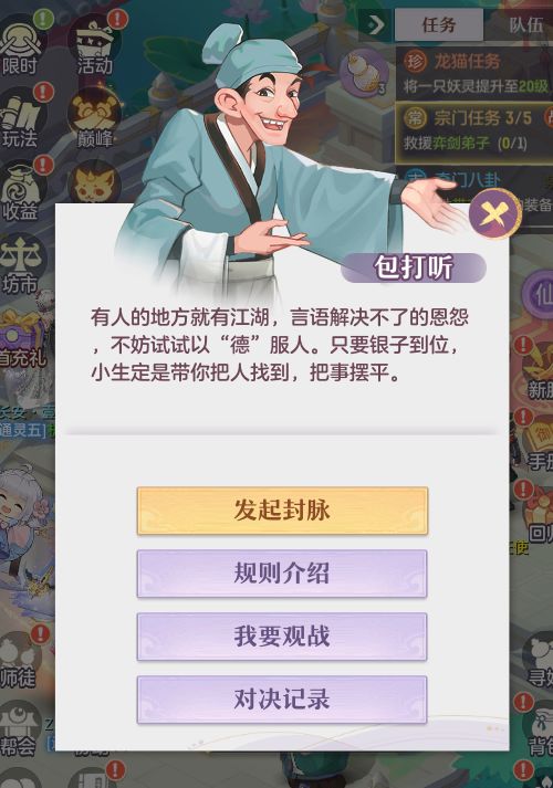 而封脉对决就是能给大家一个解决事情的舞台,毕竟对决是以技艺较高下,更易令人心服口服;当然战败者也会被打到“封脉”(无法在世界频道发言一段时间)。此效果无论是发起者还是被发起者,战败就会出现!此外世界也会流传出一则有关这场战斗的胜负传闻~