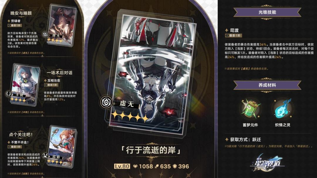 装备者命中陷入泡影的敌人时,除了基础的24%伤害加成外,对终结技还能提供额外的24%伤害加成,对于以终结技为主的角色来说收益很高。