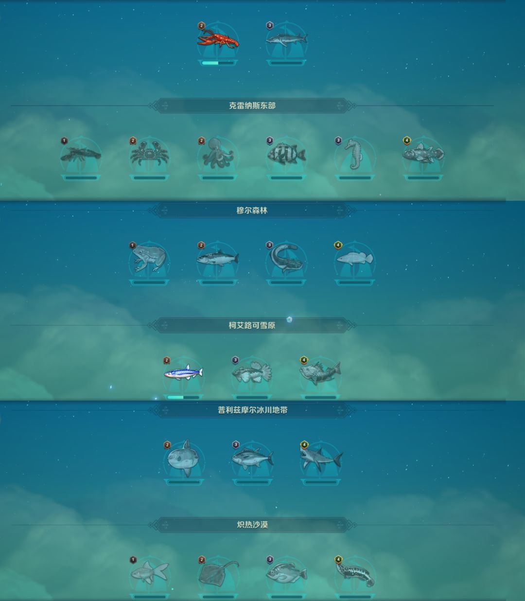 地区特色钓物中的淡水钓物,包含物海洋龙虾、章鱼、石鲷、海马、腔棘鱼、冰鱼、希特特里鱼、雪原幽灵、翻车鱼、黑鲔鱼和大白鲨。
