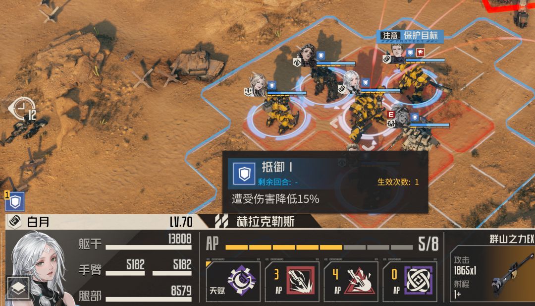 接着是纯再动技能【一鼓作气】的演示,例如上图我方白月在再动前是2点AP,再动后直接回复到了6点AP并且重新开始一个完整回合,相当于又可以最多行动4次进行4次输出等,所以这个再动技能的实际意义其实是非常之夸张的,当然官方给的3回合cd也算比较夸张......