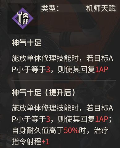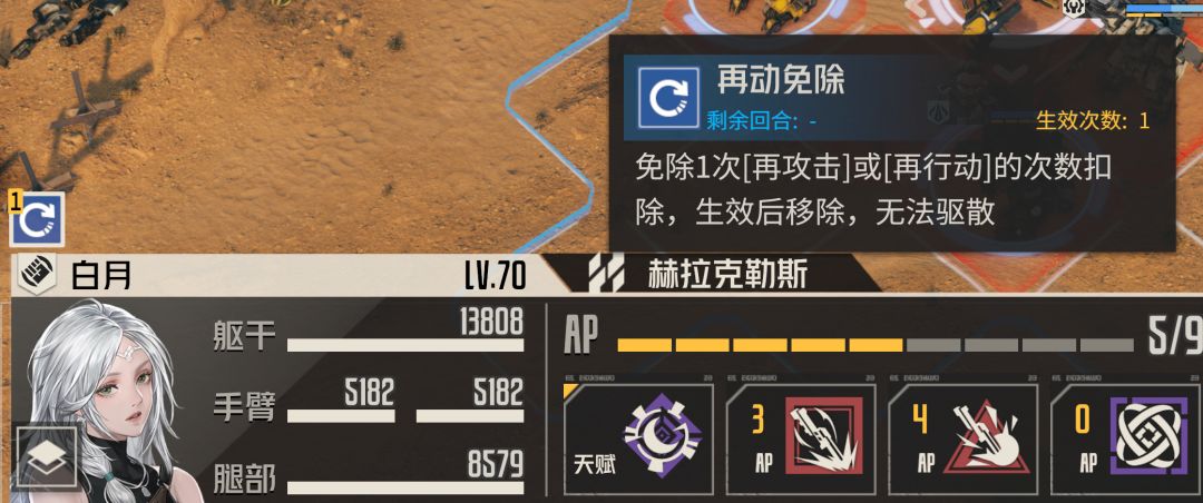 首先再给了再动次数免除的单体回复技能后,我方机师的头上会出现一个再动免除buff的标识,比如我方格斗家单回合最多可以行动4次,有了这个buff后就是可以行动5次,以此类推。此外罗娜的单体治疗技能使用后,我方机师的AP上限还会提升1点,并且是永久提升。