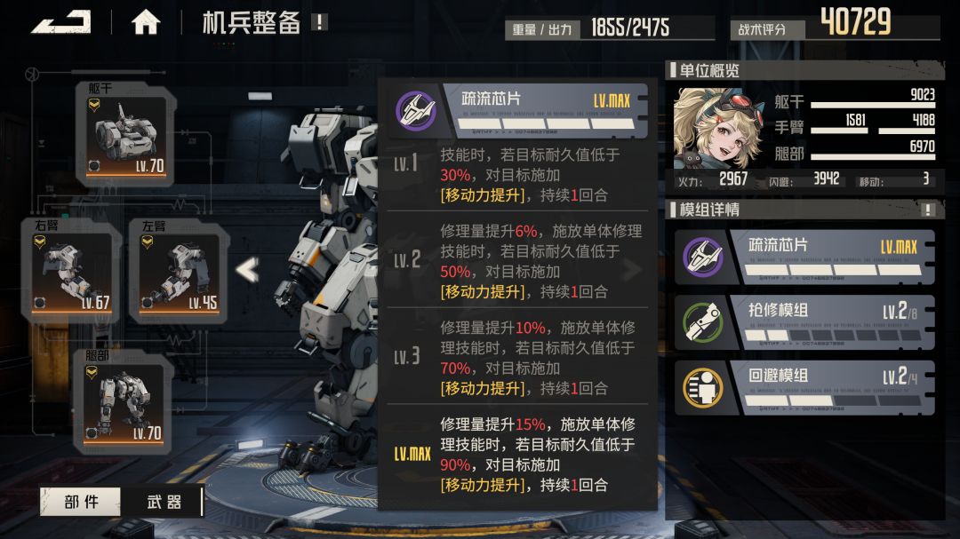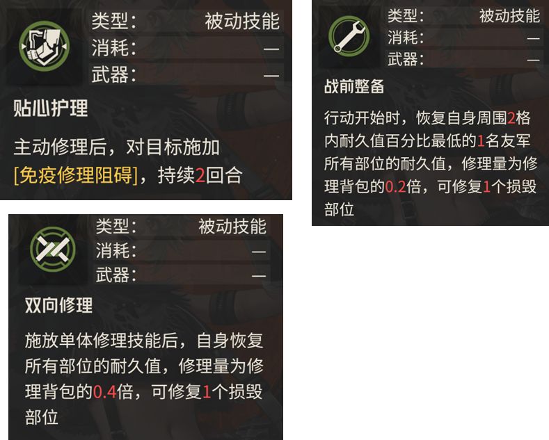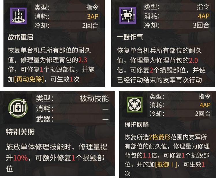 接着是罗娜的前4个技能,其中部分在昨天的讲解中已经提到了,一个纯再动技能+一个半再动技能,一个群体可以触发1次减伤15%的范围奶技,还有一个单体额外修复部位的被动。