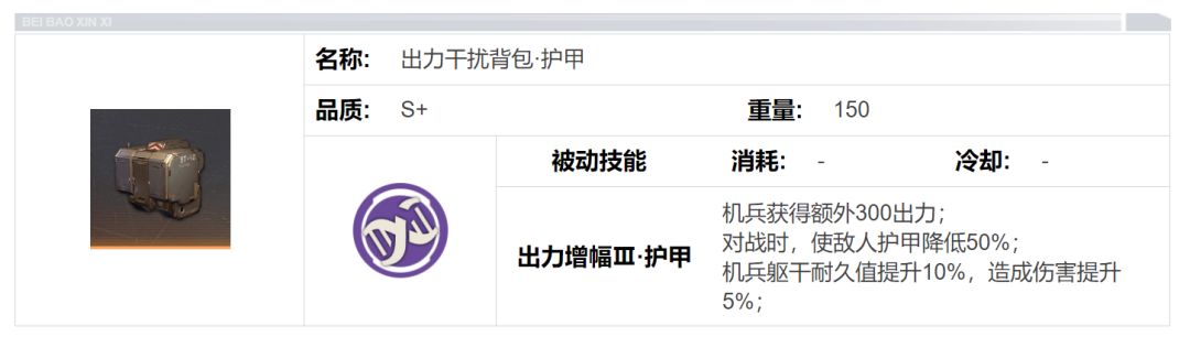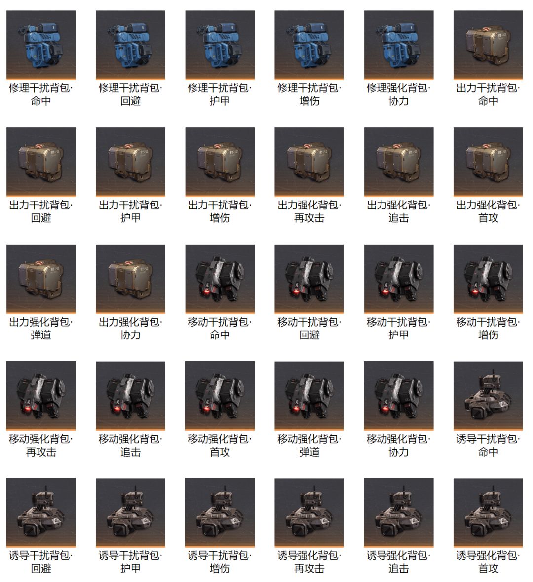 而在数量如此之夸张的符合背包种类当中,维一也是挑选出了其中适用范围相对较广的几种来做具体分析与推荐:(按照目前复合背包图纸的获取数量来讲,其中修复类、诱导类、飞行类、雷达类暂时都不用考虑,其余则可分情况考虑)
