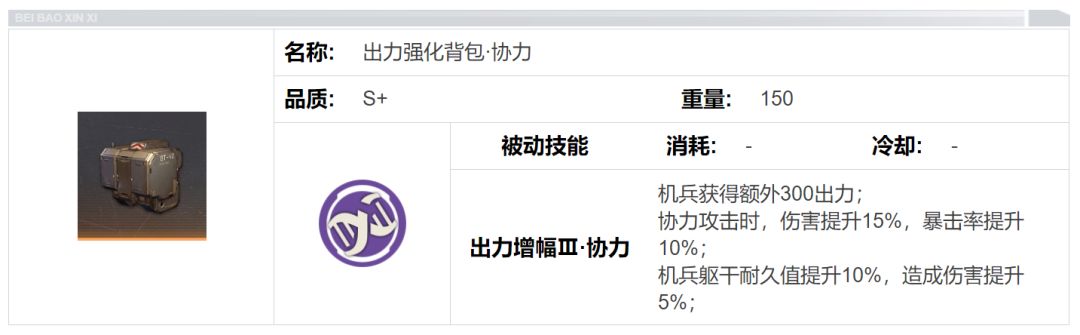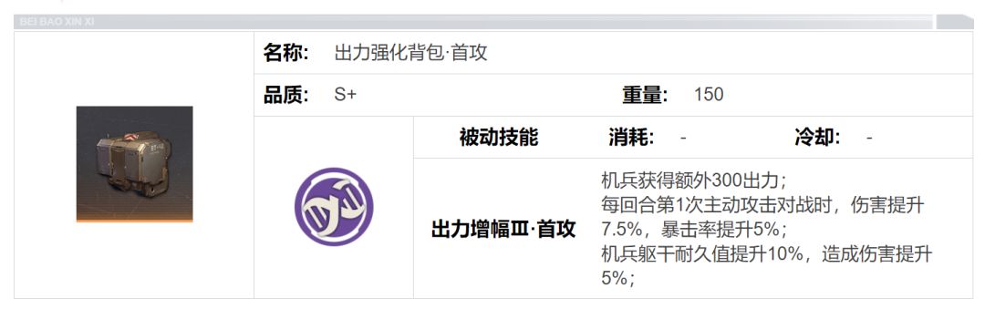 最后便是5个出力背包,目前比较常规能用的上出力背包的就是威廉、潜能3以下的艾琳和洛莎这3位了,其中威廉可以选择多种出力复合背包,维一自己选的是出力协战背包;而艾琳的话一般要用这个复合则可以考虑出力首攻;而洛莎的的话考虑因素则和刚刚讲到的部分移动类复合背包类似了,至于增伤、弹道还是破甲等需要视战斗环境来甄别取舍。