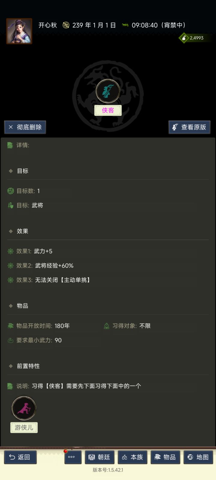 作为史诗级(紫色)职业,侠客拥有五点面板武力加成,为所有特性最高。其武将经验+60%是其他史诗级职业的一倍,负面特性必须开启单挑是不是也可以接受呢。