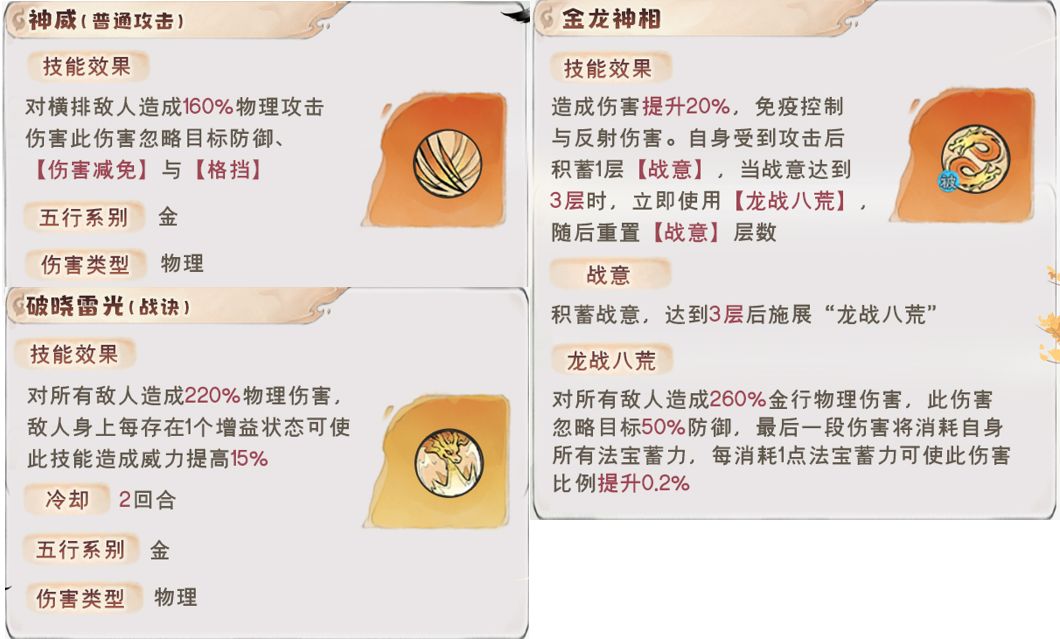 - 道兵【雷宵】:每次行动后增长法宝蓄力,可以加强【龙战八荒】的最后一击,敖天退出【金龙神相】后获得100%法宝蓄力,即刻进入兵家通用【神甲】状态,又有两回合的锁血。