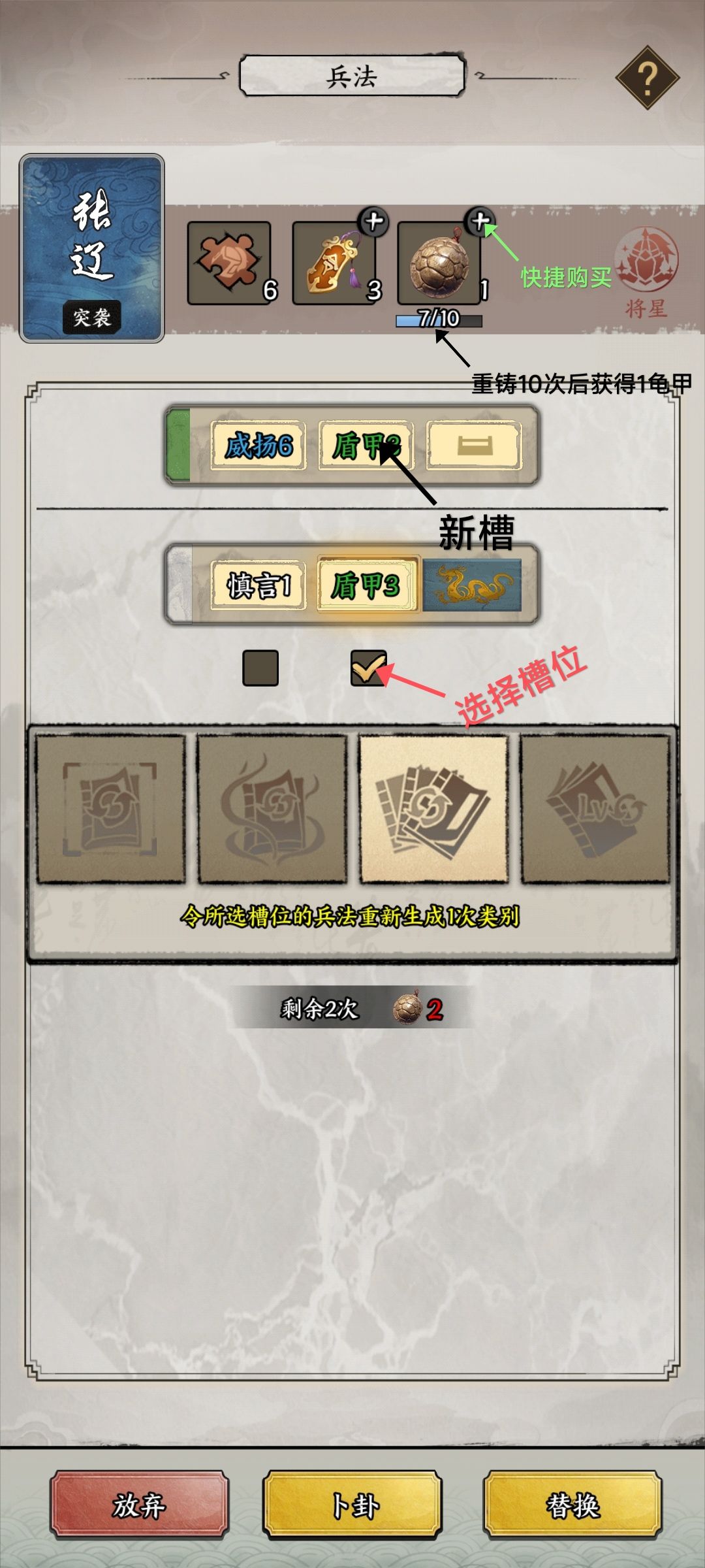 热知识:重铸过程中,如果龟甲不够,可以大退一下,等有龟甲了再点击武将使用。刚开槽后,如果点放弃(点继续默认放弃),会继承最后一个兵法(刷紫必备技能),所以只需要用龟甲洗最后一个槽就可以了。如果最后一槽类别已拥有,会变为继承前一槽的结果。